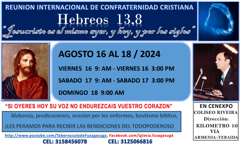 Se celebro la Reunion internacional iglesia cristiana tabernáculo de Fusagasugá semillero de águilas en el mes de agosto durante los días 16,17,18 del mes de Agosto, el el Coliseo Gran Riviera. https://youtu.be/E15djr92Xi8?si=_a-UI_5eVMlkYcLg